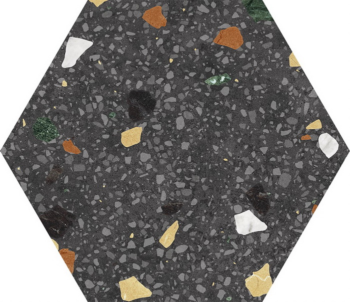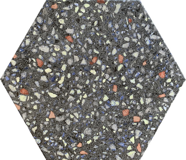 名稱:黑彩點抿石六角磚(霧)
